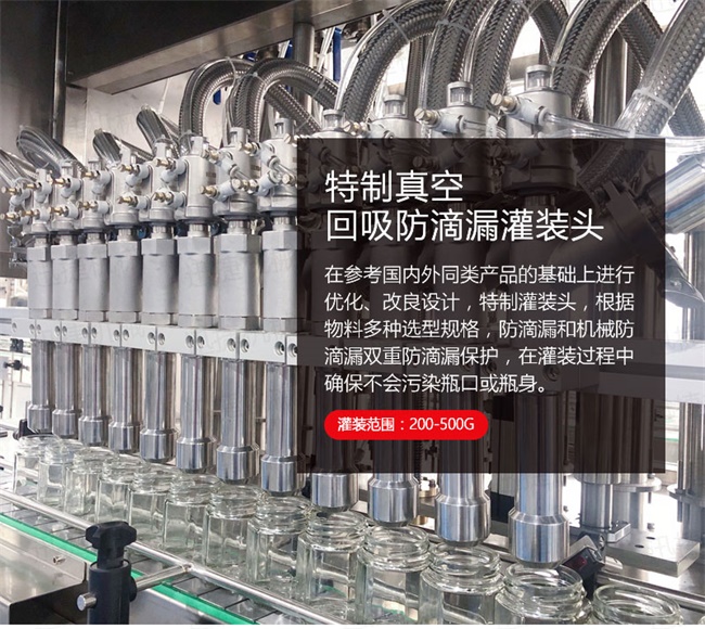 3、灌裝機采用橫推料的方式,大大縮短了下料斗到灌裝頭的距離,提高了灌裝速度,更重要的是解決了含油量大的物料在灌裝過程中出現的有些瓶油多,有些瓶醬多的灌裝難題,大大提高了灌裝精度。