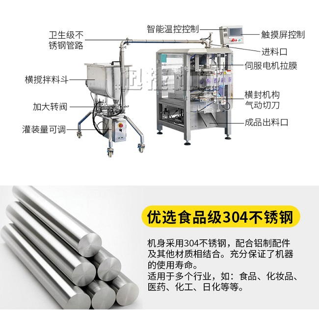 本機器主要用于調味品醬料的自動化包裝,機器安裝有橫向螺帶式攪拌,使油醬混合均勻,確保灌裝精度和產品包裝成品的均勻性。灌裝計量設備安裝有萬向輪,管路鏈接均采用快拆接頭,方便灌裝機拆卸移動清洗。包裝設備采用全伺服驅動器,包裝速度快,運行穩定。設備構成組件:攪拌式定量灌裝機一臺管道鏈接組件2米。