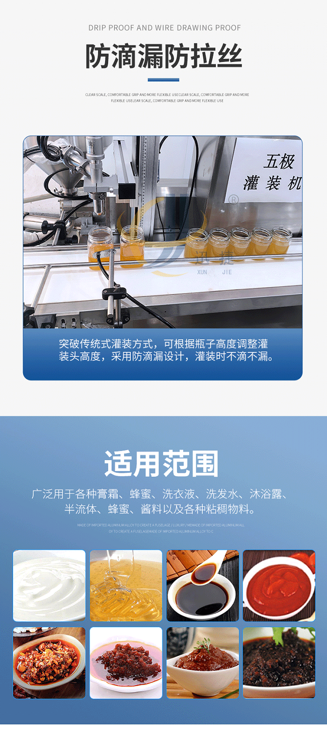 我公司新研發(fā)五極醬料灌裝機(jī),五極分為極快,極簡(jiǎn),極穩(wěn),極廣,極準(zhǔn),廣泛適用于各種膏霜、蜂蜜、洗衣液、洗發(fā)水、半流體、蜂蜜、醬料以及各種粘稠物料,該產(chǎn)品支持定制,選用306不銹鋼材質(zhì),灌裝精度高,防止滴漏,選用plc觸屏智能控制,防滴漏防拉絲,突破傳統(tǒng)的灌裝方式,可根據(jù)瓶子高度調(diào)整灌裝頭高度,采用防滴漏設(shè)計(jì),灌裝時(shí)不滴不漏。