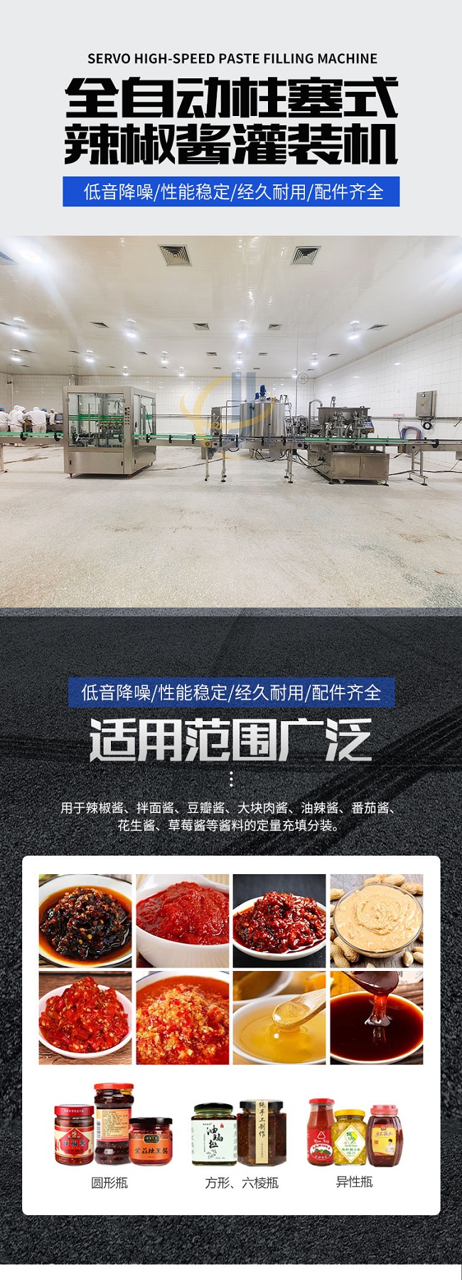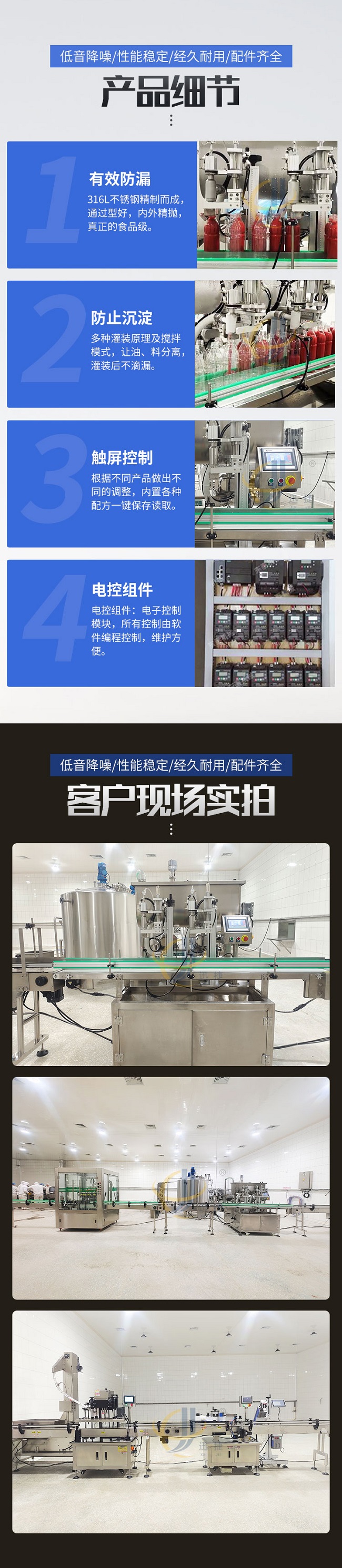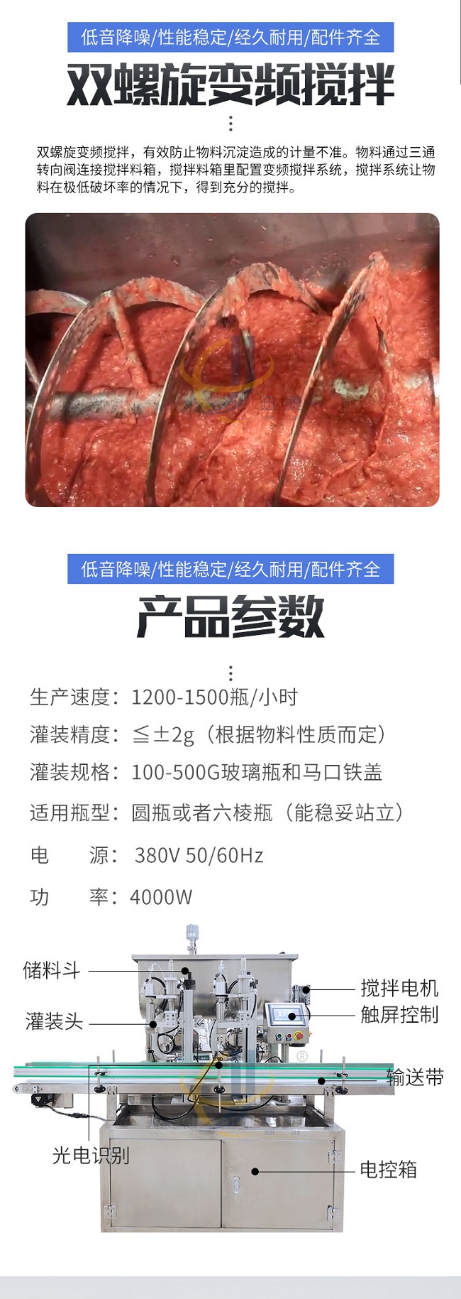 這款柱塞式辣椒醬灌裝機(jī)低音降噪、性能穩(wěn)定、經(jīng)久耐用、配件齊全,適用范圍廣泛用于辣椒醬、拌面醬、豆瓣醬、大塊肉醬、油辣醬、番茄醬花生醬、草莓醬等醬料的定量充填分裝。雙螺旋變頻攪拌,有效防止物料沉淀造成的計(jì)量不準(zhǔn)。物料通過三通轉(zhuǎn)向閥連接攪拌料箱,攪拌料箱里配置變頻攪拌系統(tǒng),攪拌系統(tǒng)讓物料在極低破壞率的情況下,得到充分的攪拌。