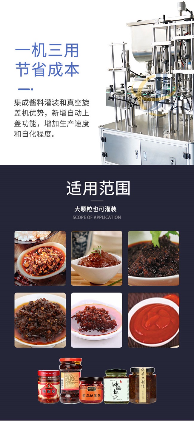 現在的生活節奏也比較快,牛肉醬也比較方便購買,網上、超市都有的售賣,所以許多的商家開始與全自動牛肉醬灌裝機廠家直銷進行合作,全自動牛肉醬灌裝機您知道如何選購嗎?這時候在灌裝顆粒比較大或者比較粘稠或比較干的醬料的時候,我們全自動牛肉醬灌裝機采用柱塞式進行計量,保證定量準確可靠,可用于多種瓶型,換瓶型只需要更換一套模具,模具更換的時間約為15分鐘左右,為了迎合社會發展的主題,全自動牛肉醬灌裝機效率高,幫助了很多企業解決了人工難題也更受消費者歡迎。
